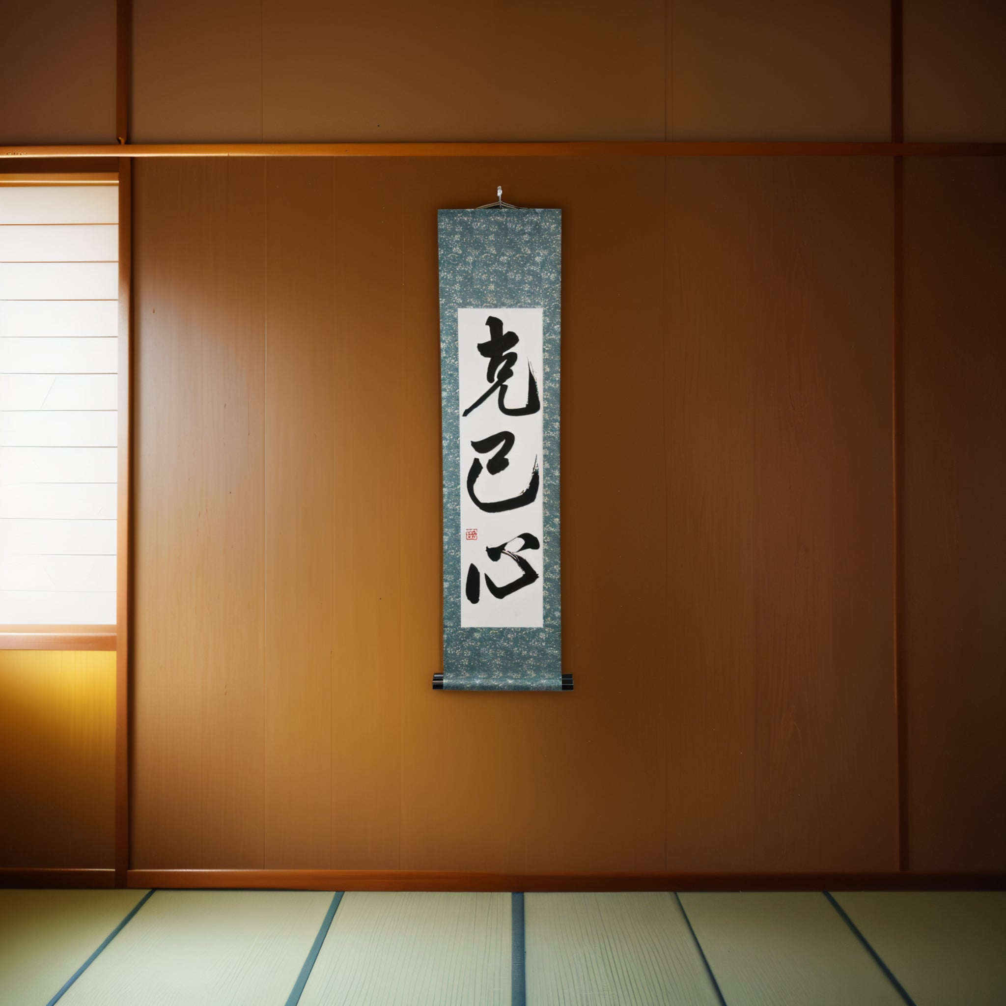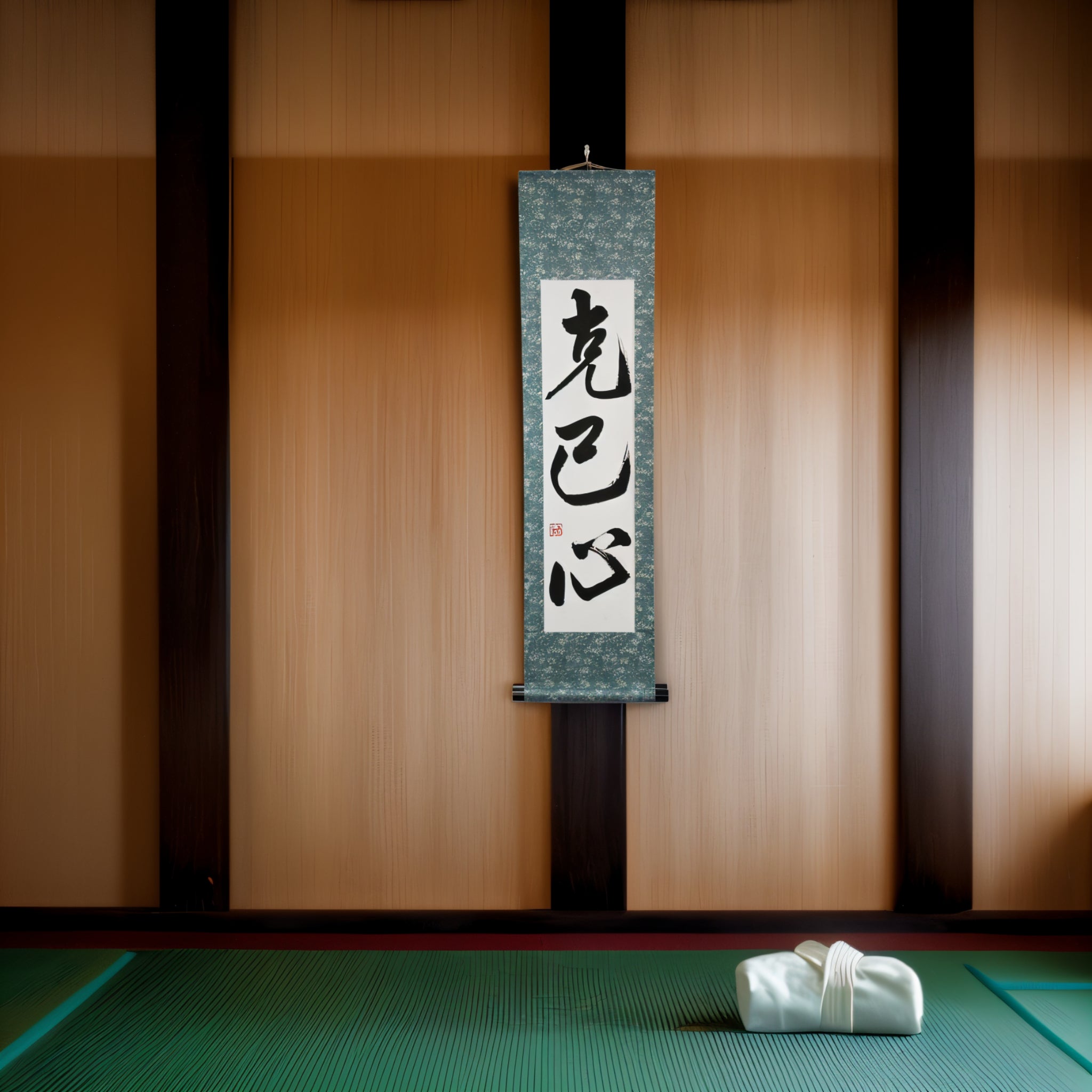 This Japanese calligraphy scroll features the powerful term 克己心 (Kokkishin), meaning "the spirit of self-mastery". It represents a universal principle across Karate, Judo, and Aikido — the idea that the greatest opponent is often within.