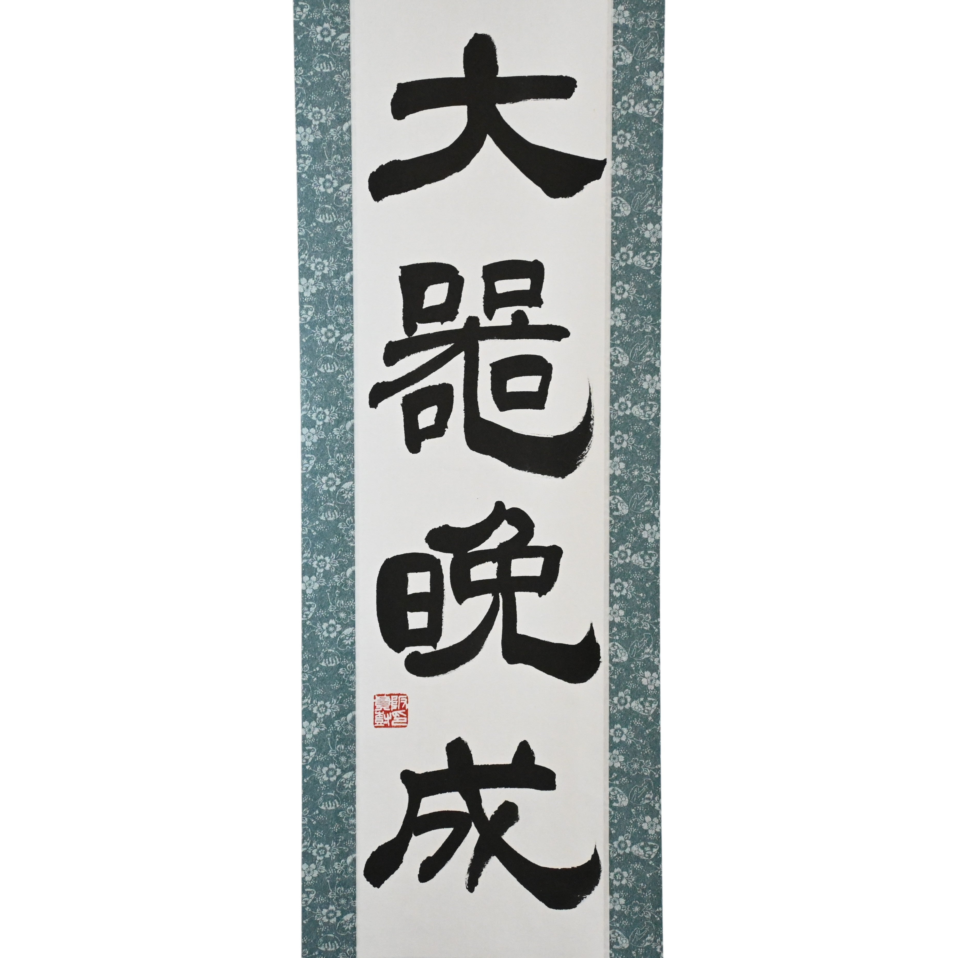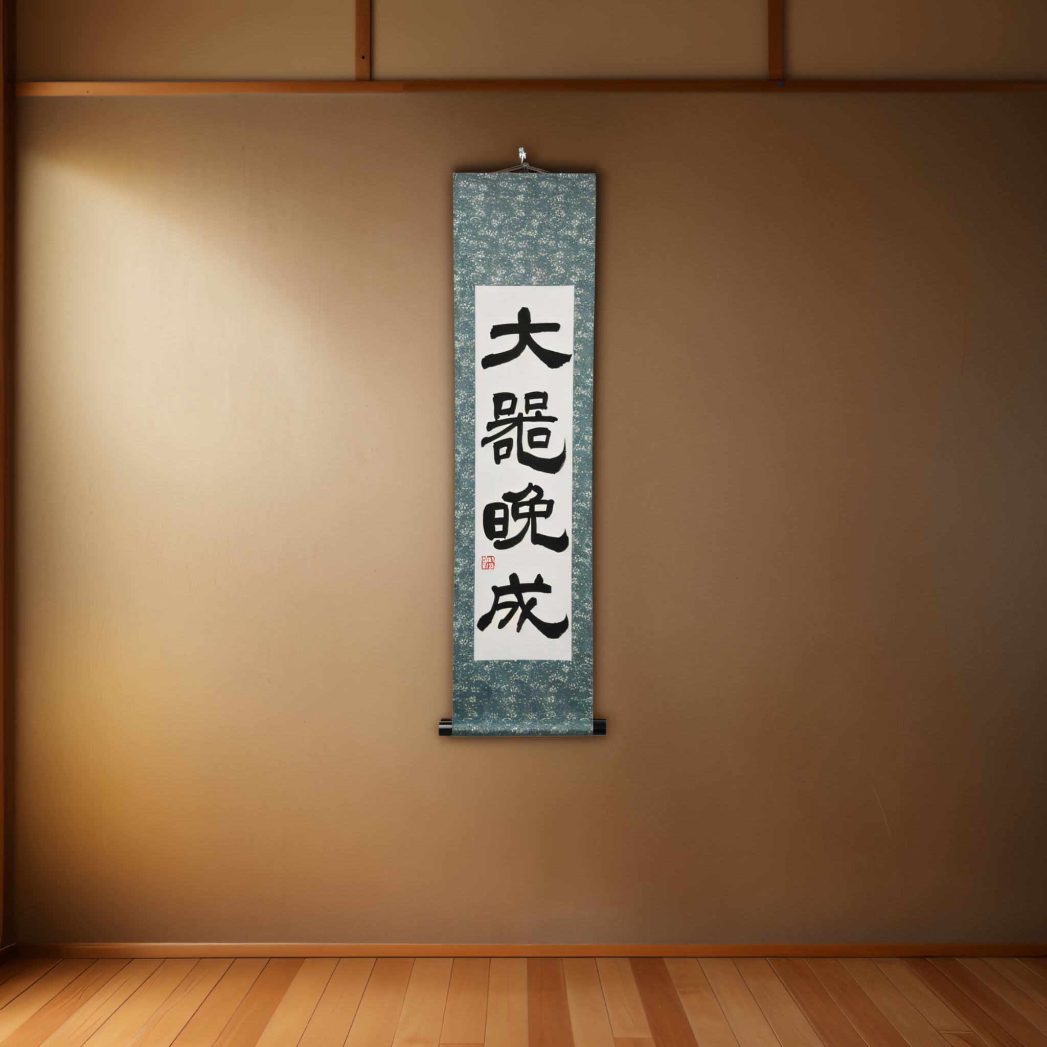 Este pergaminho de caligrafia japonesa apresenta a frase atemporal 大器晩成 (Taiki Bansei) — uma expressão clássica enraizada na antiga filosofia asiática. Literalmente significando “um grande vaso demora a se formar”, ela ensina que a verdadeira grandeza não aparece rapidamente. O talento, força e caráter mais profundos são moldados lentamente, através de anos de experiência, disciplina e crescimento interior.