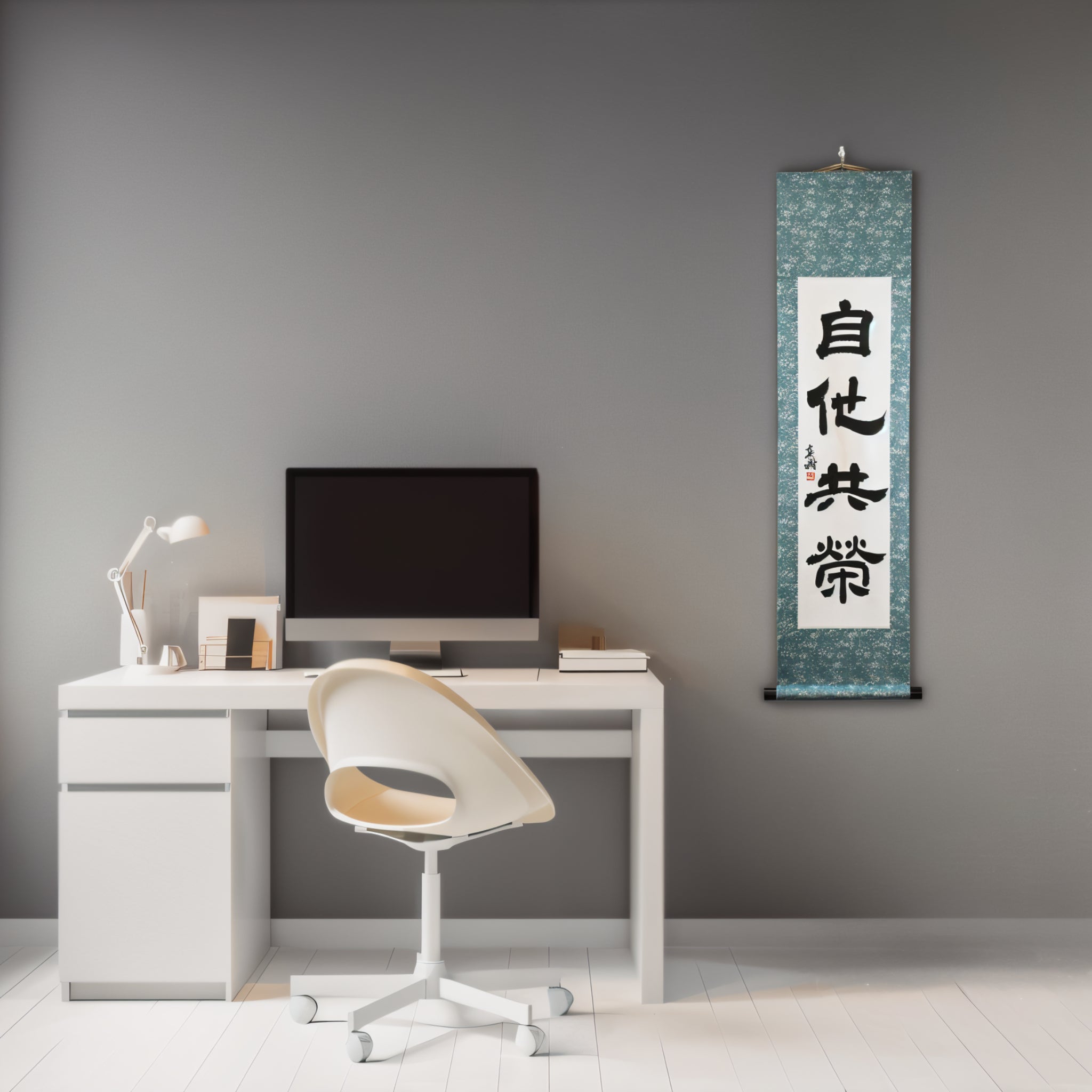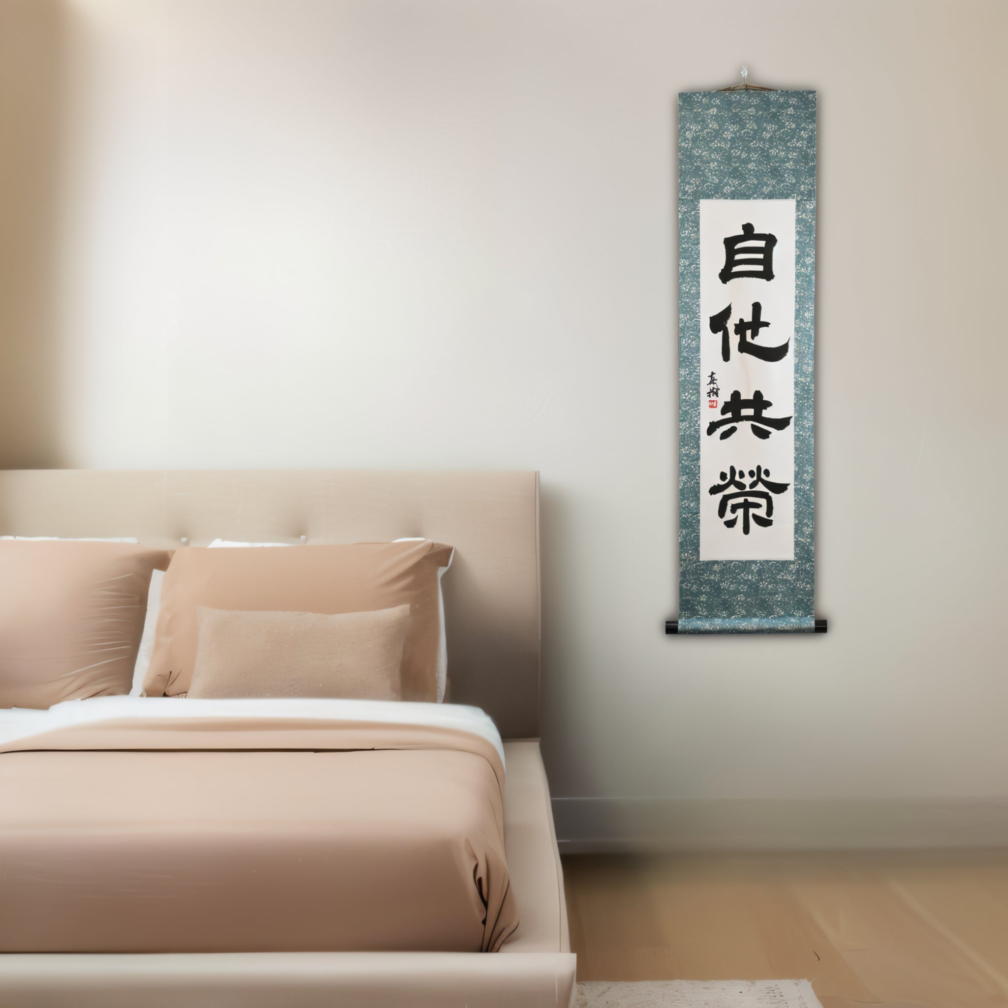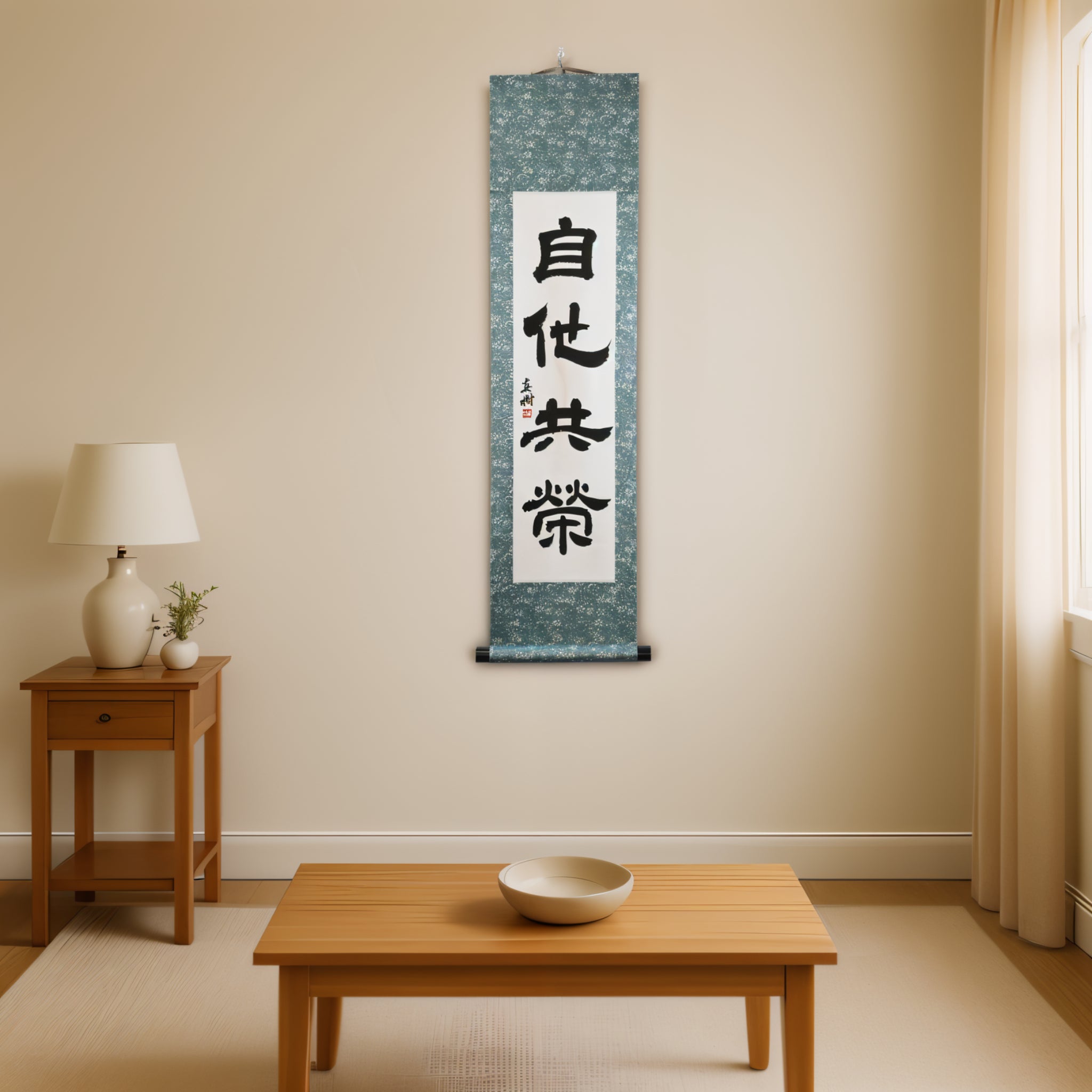 Nota: Este pergaminho está escrito no tradicional Reisho (estilo clerical) — um antigo estilo caligráfico conhecido por sua elegância silenciosa e profundidade contemplativa. Seus traços equilibrados e ritmo calmo realçam o caráter sereno de "Jita-Kyōei", conferindo à peça uma presença atemporal, inspirada no Zen, em qualquer ambiente.