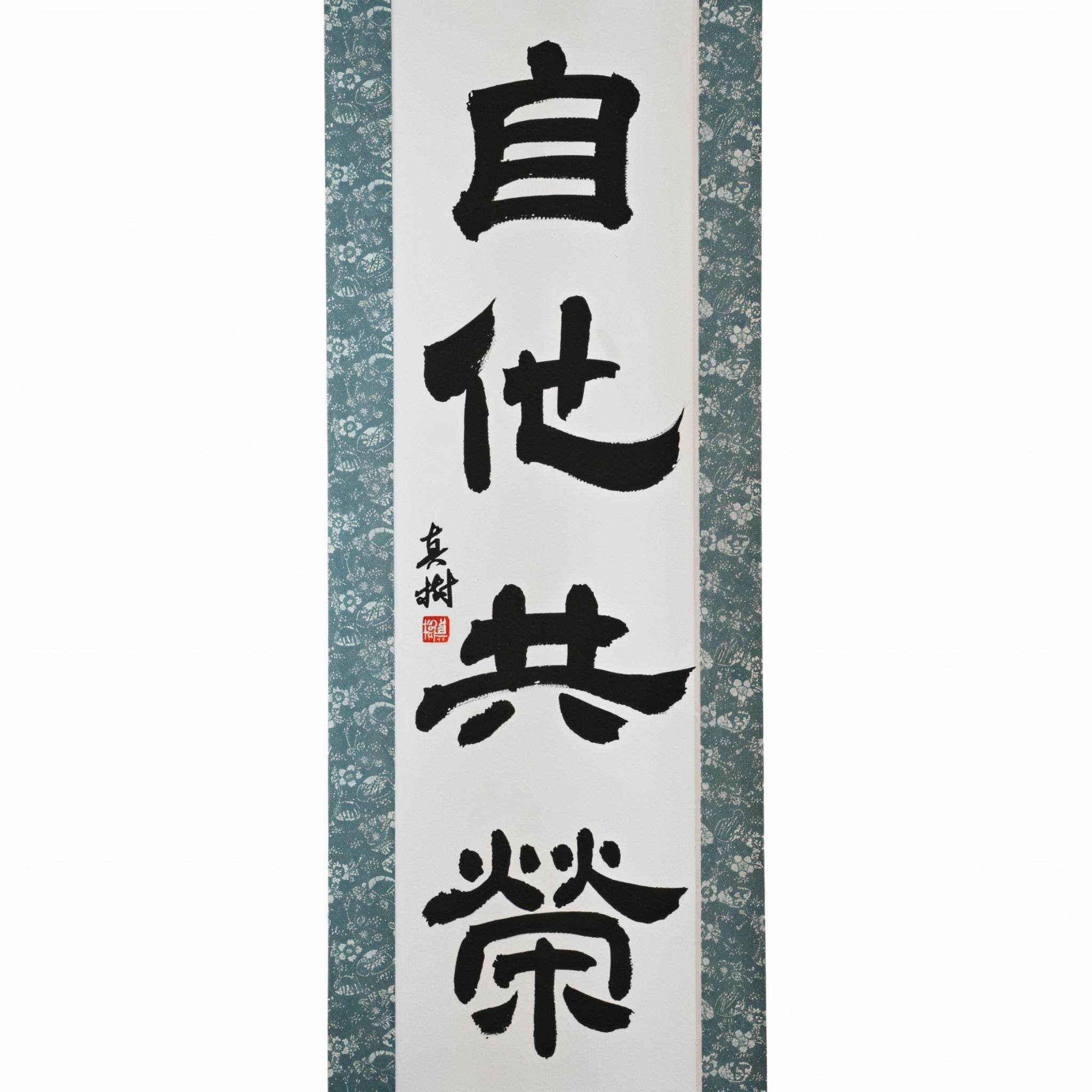 Este pergaminho de caligrafia japonesa apresenta a frase atemporal 自他共栄 (Jita-Kyōei) — traduzida como "Bem-Estar e Benefício Mútuo". É um dos dois princípios fundamentais do Judô, ao lado de 精力善用 (Seiryoku-Zenyō, "Uso Máximo e Eficiente da Energia"), ambos estabelecidos pelo fundador do Judô, Jigoro Kano (嘉納治五郎).