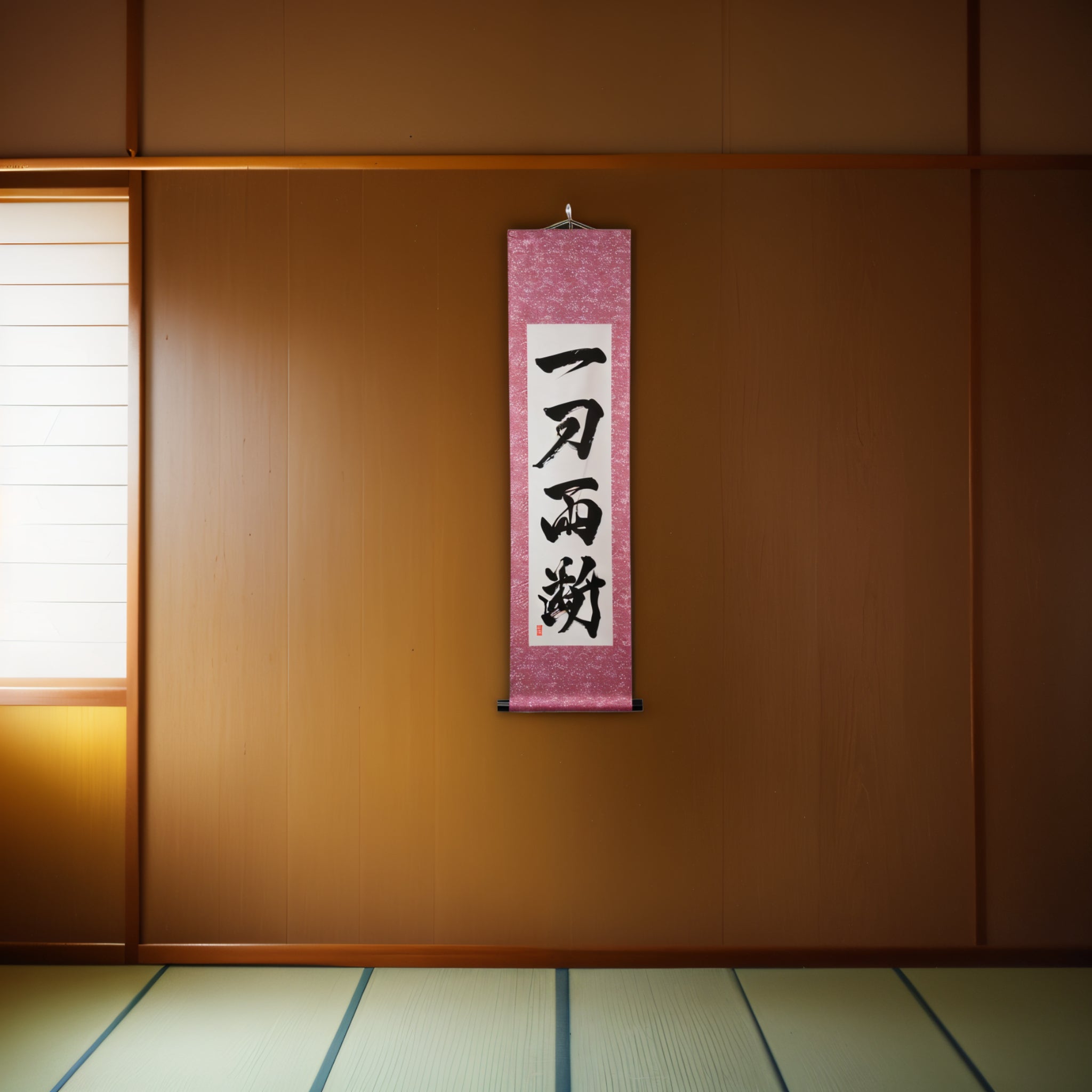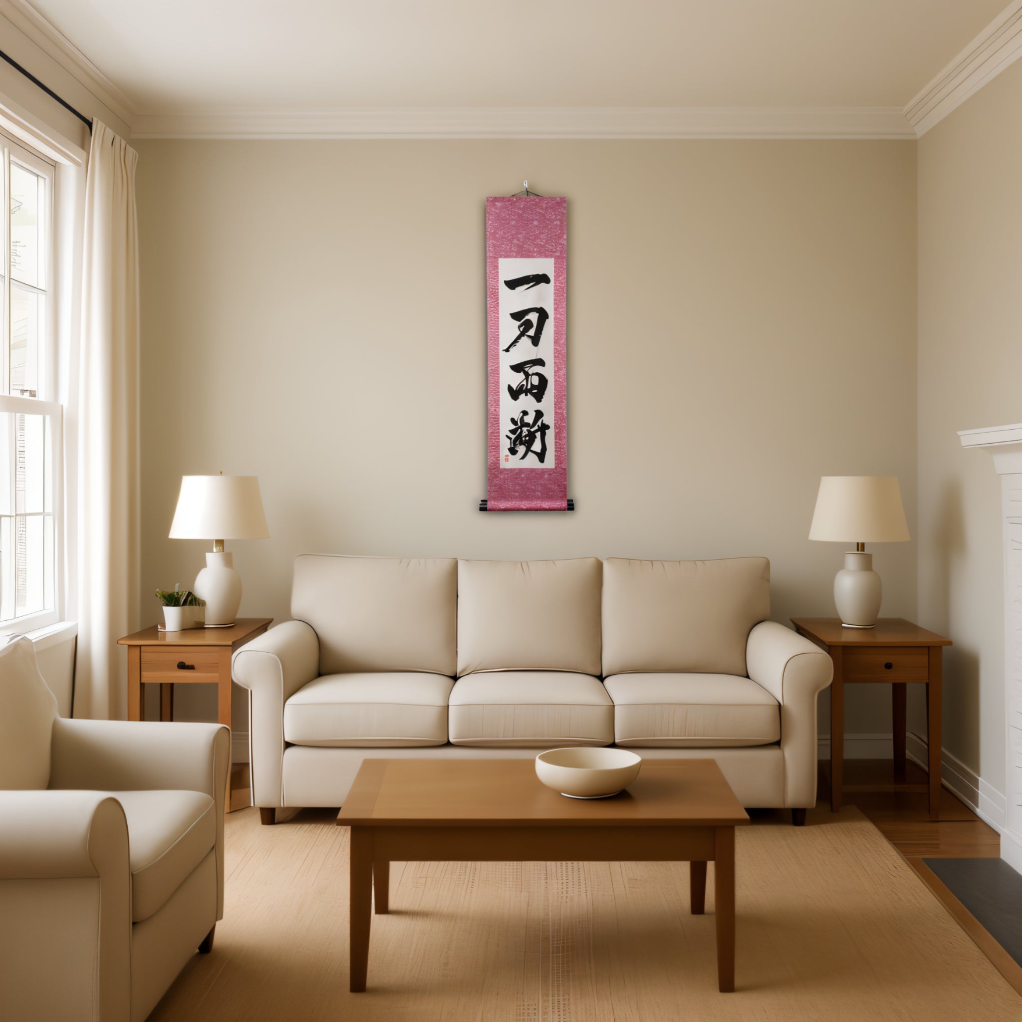 Este pergaminho de caligrafia japonesa exibe ousadamente a frase 一刀両断 (Ittō Ryōdan) — uma expressão poderosa que captura a determinação inabalável e a clareza do espírito samurai.
