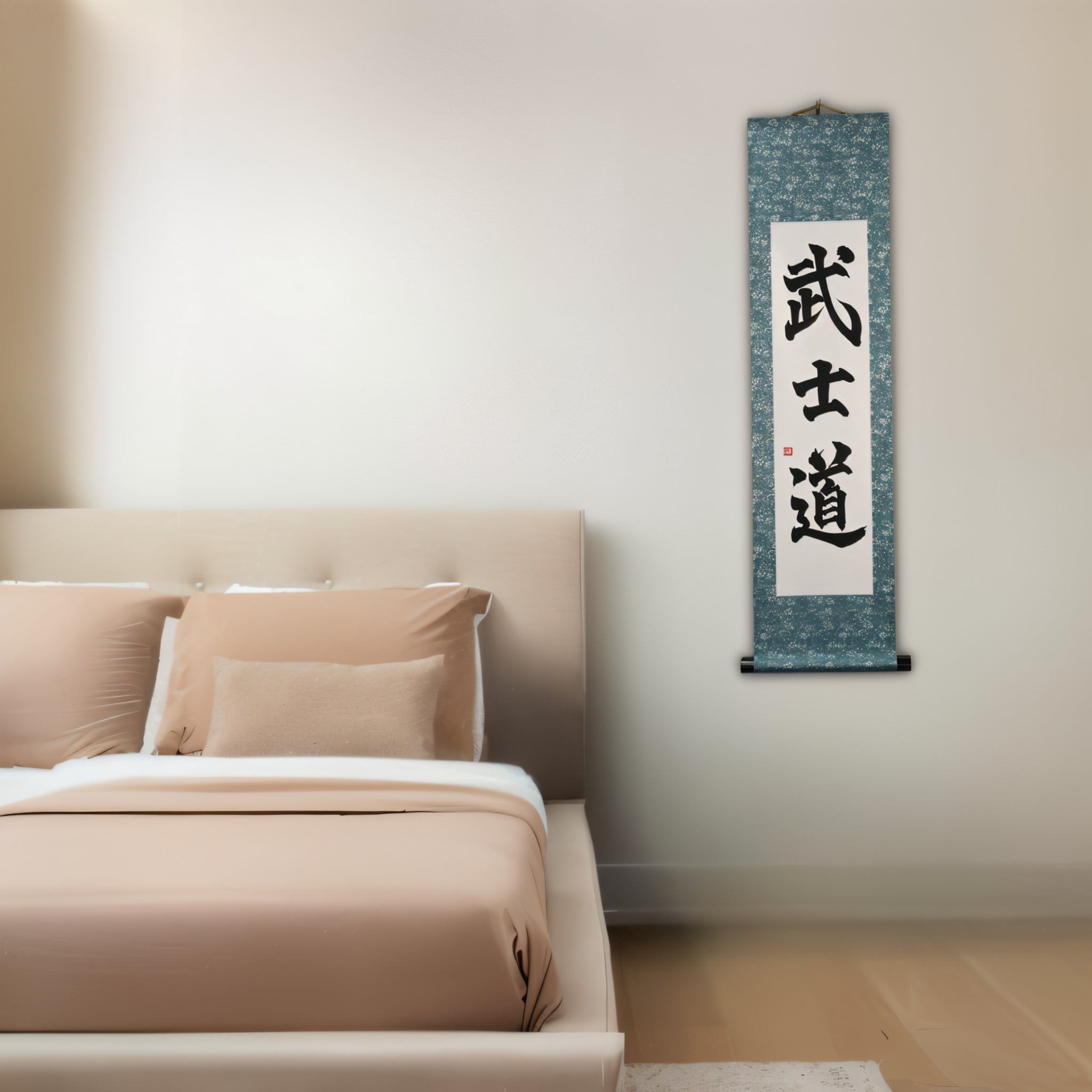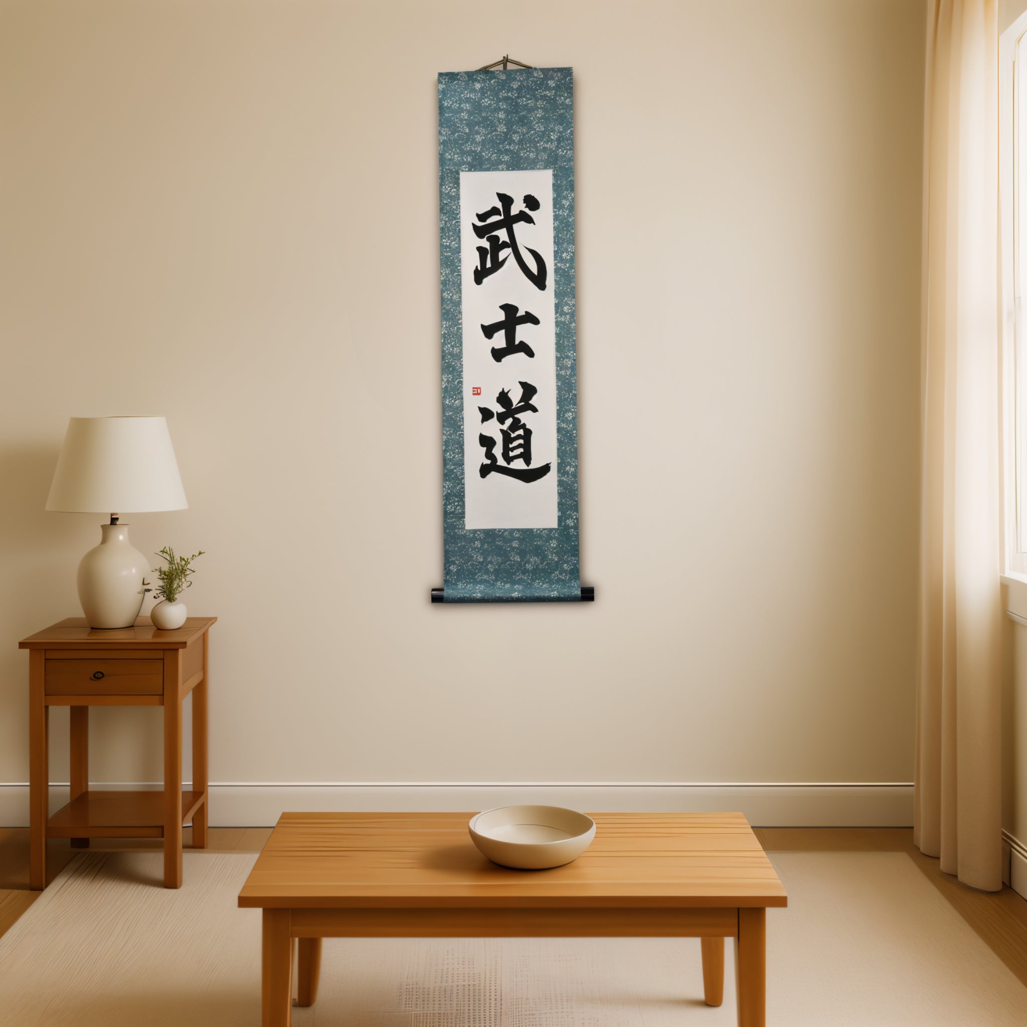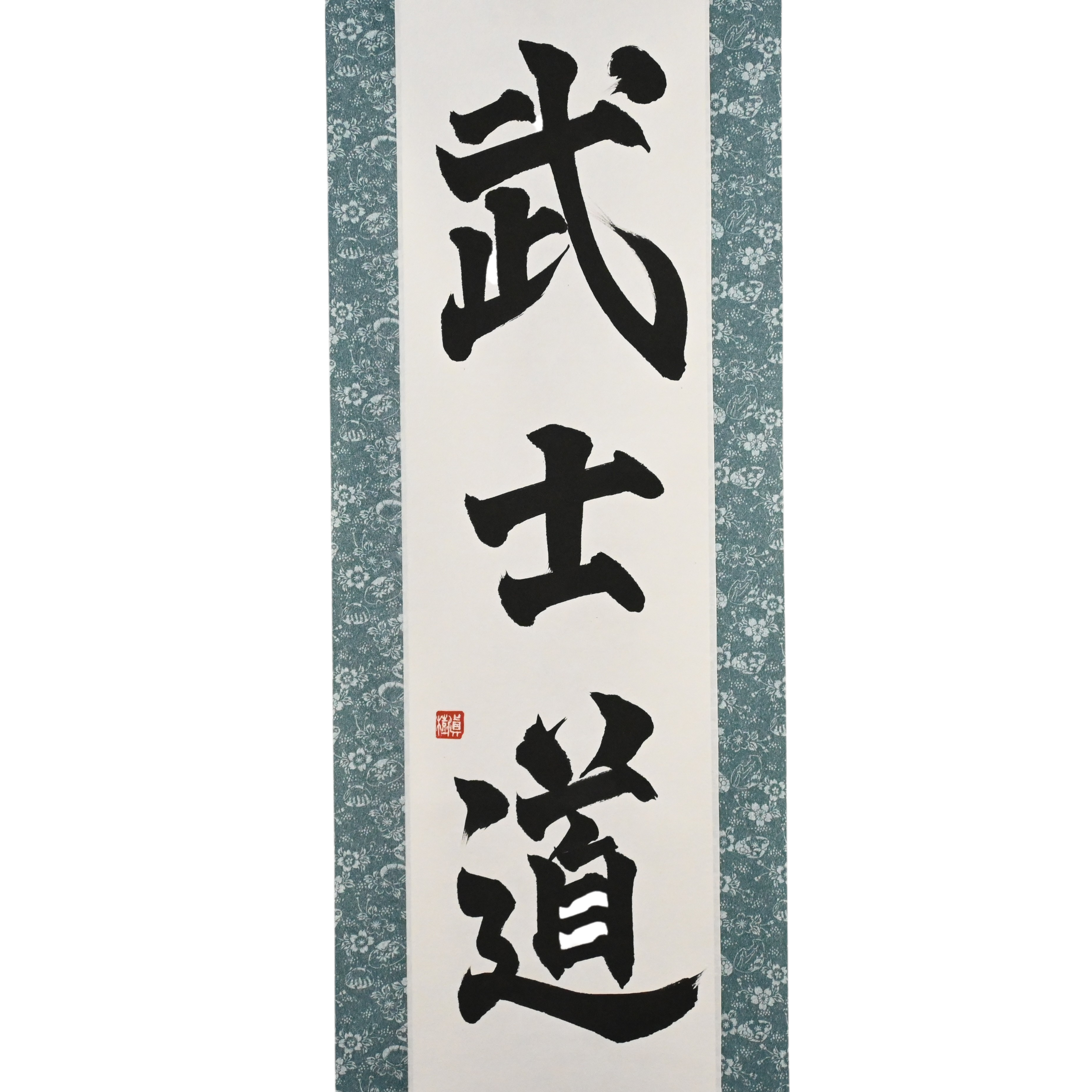 Este pergaminho de caligrafia apresenta a poderosa palavra 武士道 (Bushidō), que incorpora o caminho do Samurai.